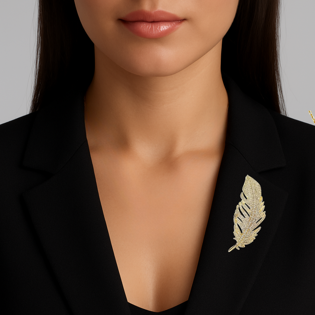 Aceasta brosa in forma de pana impresioneaza prin liniile fluide si stralucirea discreta a cristalelor, fiind alegerea ideala pentru tinute elegante sau minimaliste.