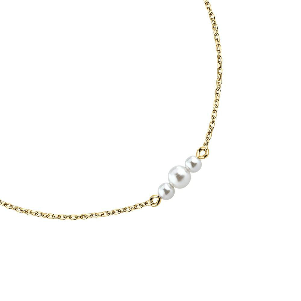 Designul este construit in jurul a trei perle: doua mai mici, asezate simetric, si una centrala, usor mai mare, care atrage subtil privirea. Un joc de proportii discret, gandit pentru a crea armonie pe incheietura.