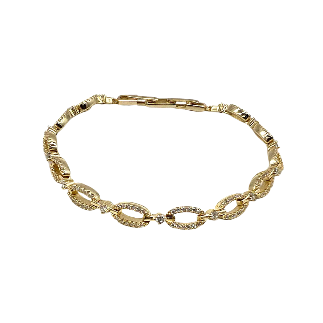 Aceasta bratara din argint 925 rodiata auriu impresioneaza printr-un design elegant si echilibrat, construit din zale ovale decorate cu diamante CZ albe, atent montate pentru un plus de stralucire discreta.