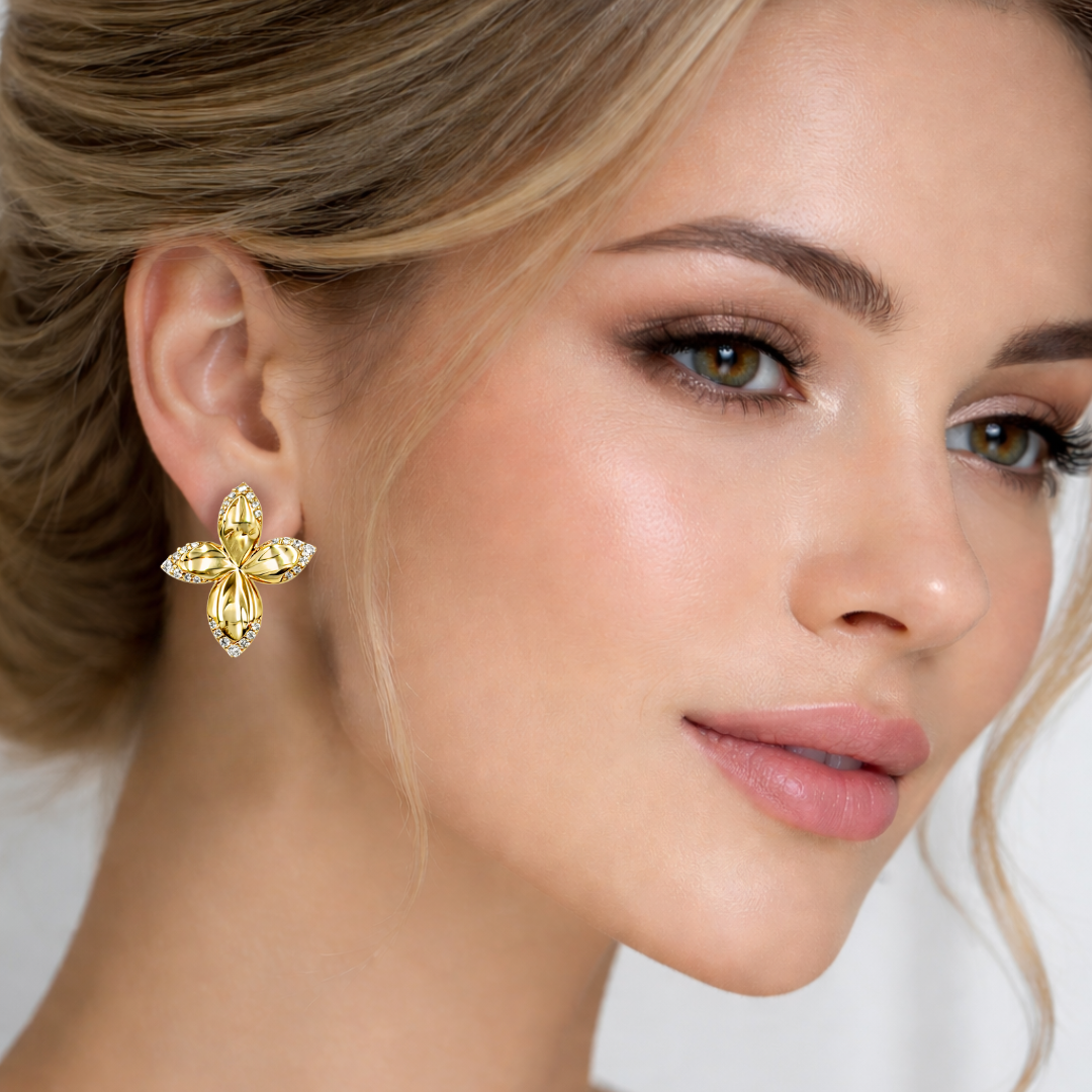 Inspirati din echilibrul perfect al formelor naturale, cerceii sunt realizati din argint 925 rodiat auriu si pun in valoare o floare stilizata, cu petale atent conturate. Marginea fiecarei petale este accentuata de diamante CZ albe, montate precis, pentru un joc subtil de lumina, niciodata ostentativ.