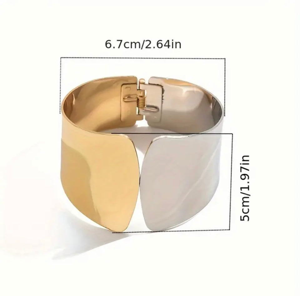 Minimalistă și sofisticată, brățara Yin and Yang Harmony este alegerea perfectă pentru femeia modernă. Designul geometric și contrastul dintre aur și argint o fac versatilă și ușor de asortat. Poart-o individual pentru un look elegant sau combin-o cu alte bijuterii pentru un efect statement.