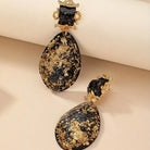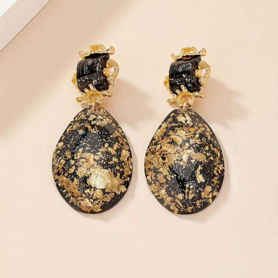 Cerceii Golden Night sunt creati pentru momentele in care nu vrei sa treci neobservata. Picaturile ample din rasina neagra, presarate cu foita aurie, creeaza un contrast puternic, sofisticat, aproape hipnotic. Fiecare pereche este diferita, cu un joc unic de lumina si textura, ca o suprafata pictata manual.