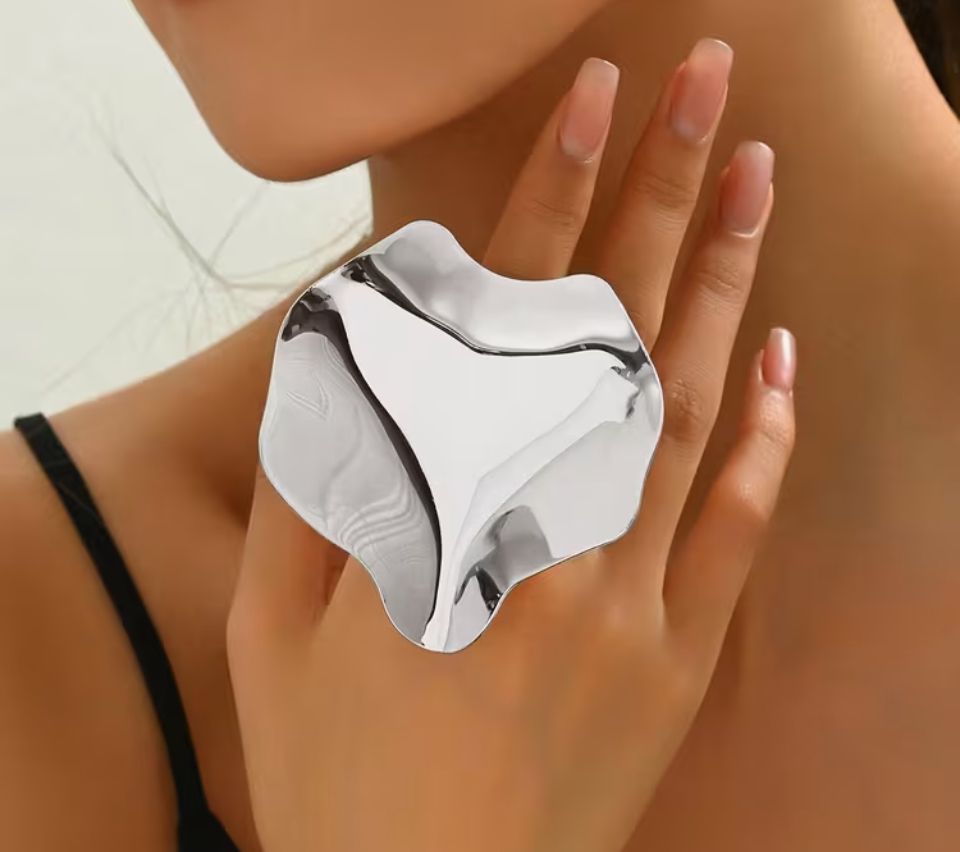 Un inel care nu trece neobservat. Cu un design supradimensionat și o suprafață neregulată, acest accesoriu redefinește eleganța modernă. Finisajul argintiu adaugă un plus de rafinament, iar forma organică îl face piesa centrală a oricărei ținute. Ajustabil pentru un confort maxim.